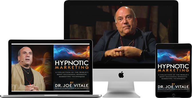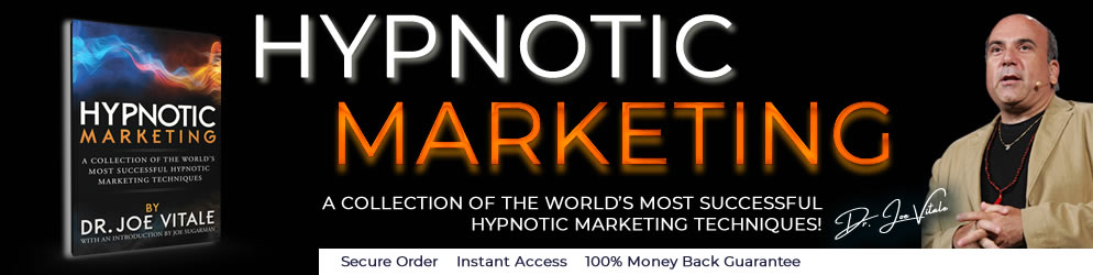 LIABILITY DISCLAIMER: By reading this website or the documents it offers, you assume all risks associated with using the advice given, with a full understanding that you, solely, are responsible for anything that may occur as a result of putting this information into action in any way, and regardless of your interpretation of the advice. You further agree that our company cannot be held responsible in any way for the success or failure of your business as a result of the information provided by our company. It is your responsibility to conduct your own due diligence. In summary, you understand that we make absolutely no guarantees regarding results of applying this information, as well as the fact that you are solely responsible for the results of any action taken on your part as a result of any given information. In addition, for all intents and purposes you agree that our content is to be considered "for entertainment purposes only". Please be advised that due to the nature of the products which Hypnotic Marketing Inc. (“HMI”) and Joe Vitale are selling, there is no possibility of substantiating any claimed results made or supplying any objective evidence, whether financial, business related, spiritual or otherwise. Full Disclosure Notice, Legal Notice, and Privacy statement can be read by clicking on the links above this statement.